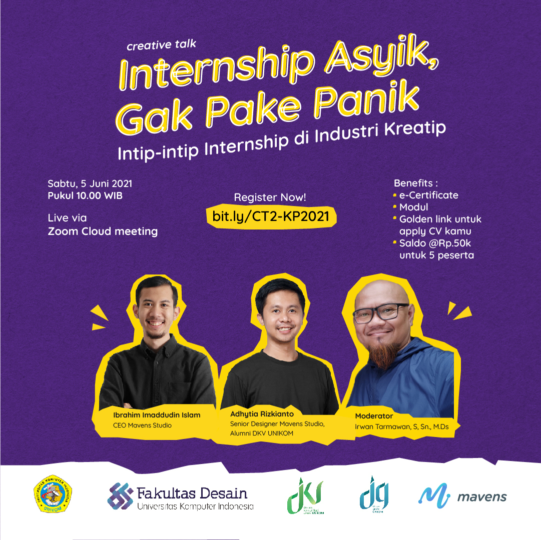 Oleh karena itu, Program Studi Desain Komunikasi Visual (DKV) dan Desain Grafis (DG) Unikom mengadakan Creative Talk mengusung tema “Internship Asyik, Gak Pake Panik” Intip-Intip Internship di Industri Kreatip. Sabtu, 5 Juni 2021 Pukul 10.00 WIB. Dengan mengundang Narasumber yakni CEO Mavens Studio, Ibrahim Imaddudin Islam dan Senior Designer Mavens Studio sekaligus sebagai Alumni DKV Unikom, Adhytia Rizkianto. Kegiatan tersebut juga didampingi oleh Moderator Irwan Tarmawan, S,Sn., M.Ds. dosen dari Prodi DKV Unikom.