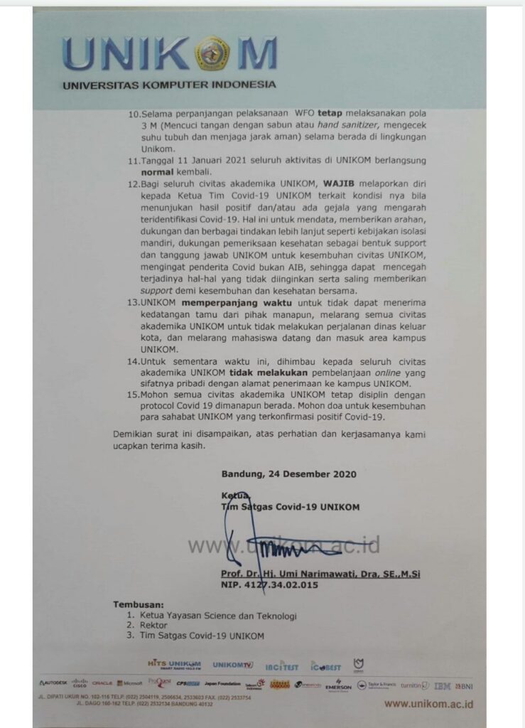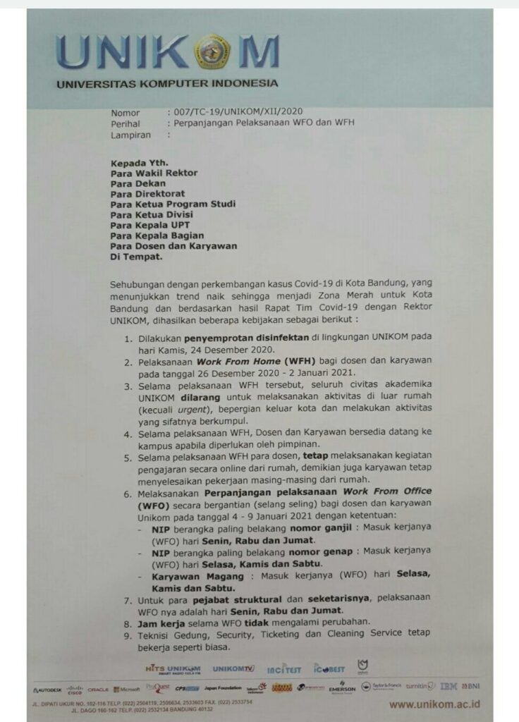 Berdasarkan surat edaran nomor 007/TC-19/UNIKOM/XII/2020 maka pelaksanaan WFO dan WFH diperpanjang sesuai ketentuan yang tercantum pada lampiran berikut: